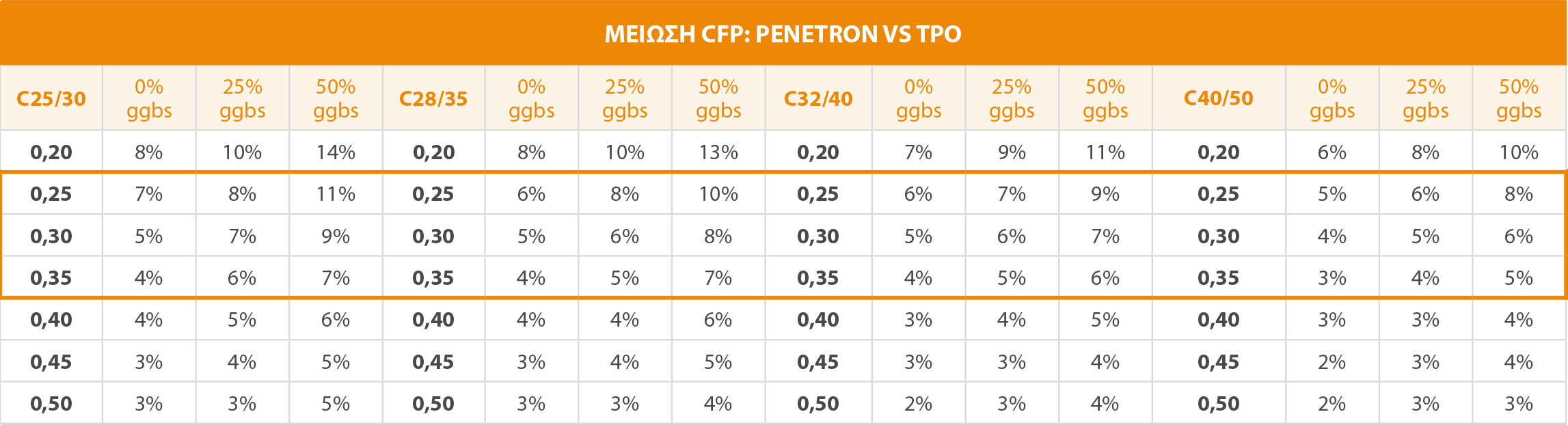 Οι πίνακες στα δεξιά συγκρίνουν τα CFP διαφορετικών μιγμάτων σκυροδέματος με το PENETRON ADMIX σε συνάρτηση m² για μέσο πάχος τοιχίου μεταξύ 0,25 και 0,35 m με τα ίδια μείγματα με τις συμβατικές επιφανειακές επεξεργασίες που αναφέρονται παραπάνω. ⁵