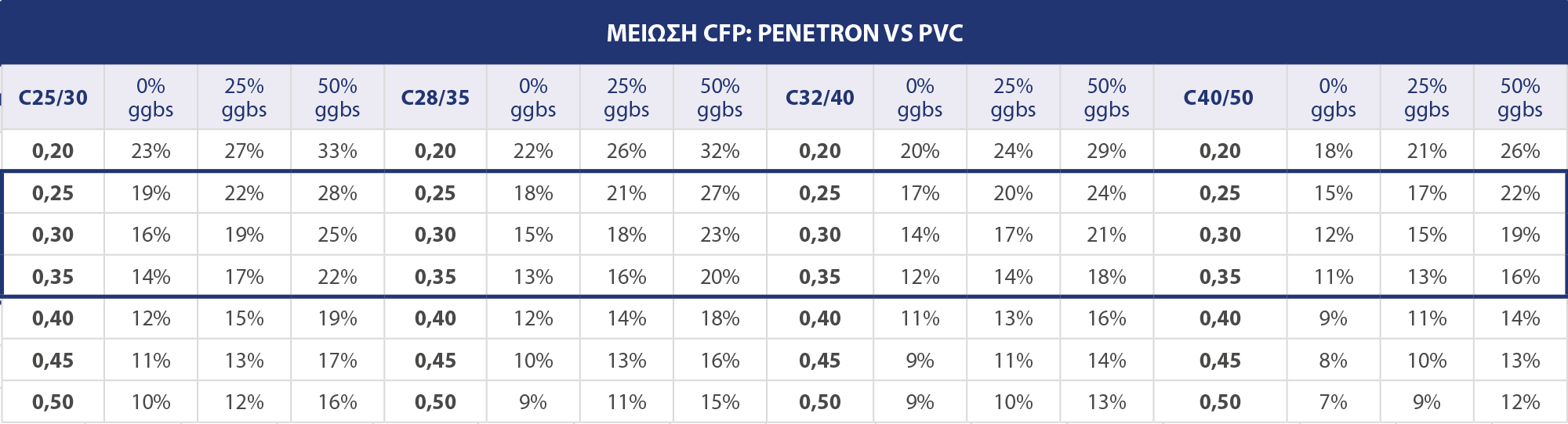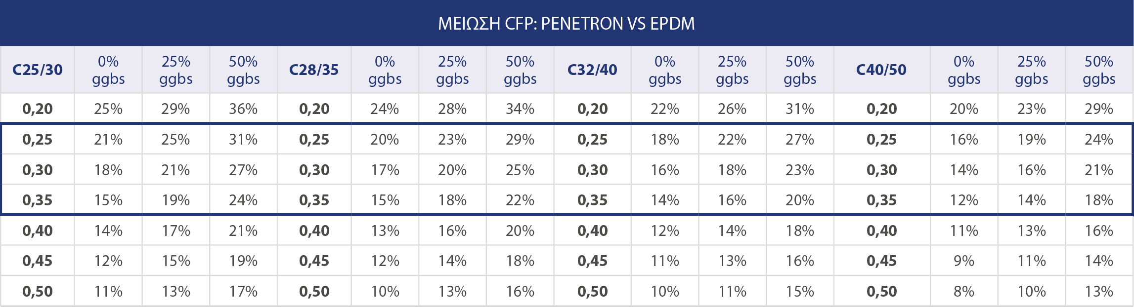 Πραγματοποιήθηκαν δοκιμές ανθεκτικότητας σκυροδέματος υπό προσβολή διείσδυσης χλωριόντων και ενανθράκωσης, με μέγιστη τιμή CFP για το PENETRON ADMIX 4,9 kg qCO2/m³.¹