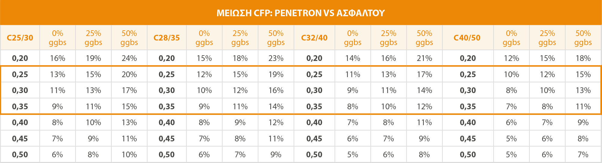 Ο παραπάνω πίνακας δείχνει πως το σκυρόδεμα που περιέχει PENETRON ADMIX, σχεδιασμένο για 50 ή 100 χρόνια ζωής, απαιτεί λίγη ή καθόλου συντήρηση – και επιτρέπει μείωση της επικάλυψης από σκυρόδεμα – παρά την έκθεση στη διάβρωση από χλωριόντα ή ενανθράκωση.